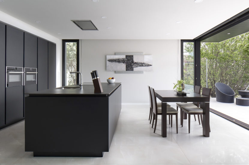 The structural lightness of the house is reflected in the linear design of the home’s exterior which features travertine marble and black sheet metal. The south-facing windows have a solar control system that regulates the temperature inside the home. Other features include an energy-efficient air conditioning system, radiant floor heating, generous insulation and low-consumption lighting.